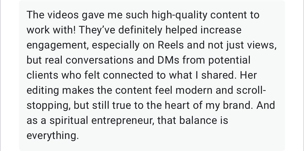 ✨ 5 highly engaging videos filmed by me (your video content fairy 🧚🏽♀️), each of these videos is a reel in itself since there is movement, so no need for editing.